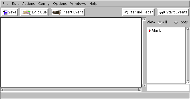 Wenn Lula startet, zeigt sie zunächst einmal ein Fenster mit einer leeren weißen Fläche an, in der ein Cursor steht. (Rechts erscheint noch eine Cue-Liste, die allerdings nur bei der Eingabe von Lichtwechseln eine Bedeutung hat.)