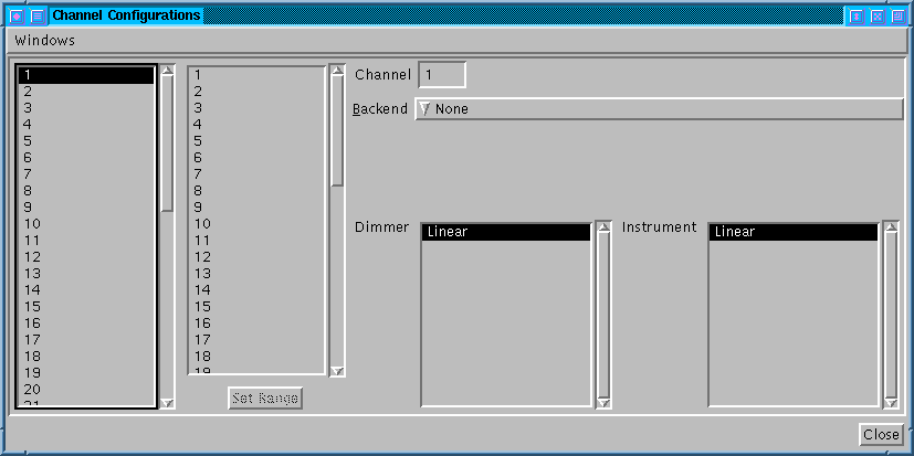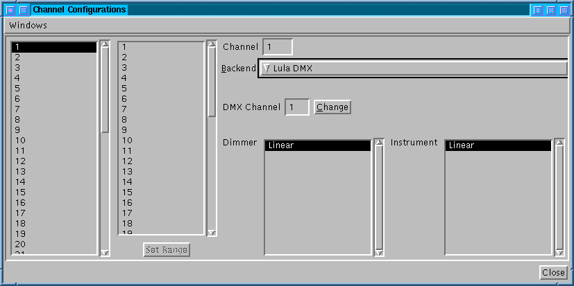 Wichtig ist dabei folgendes: Jeder Kanal kann einem beliebigen, an den Lula-Rechner angeschlossenes, Ausgabegerät, ein sogenanntes Backend, zugewiesen werden. Lula benutzt ein Standard-Backend namens None, an das alle Kanäle beim Start zugewiesen sind. Mittels Doppelklick in der linken Kanalliste läßt sich der Kanal wechseln, durch ändern des Backend-Eintrags läßt sich das Backend ändern. So läßt sich z.B. Kanal 1 an eine angeschlossene Lula DMX zuweisen :