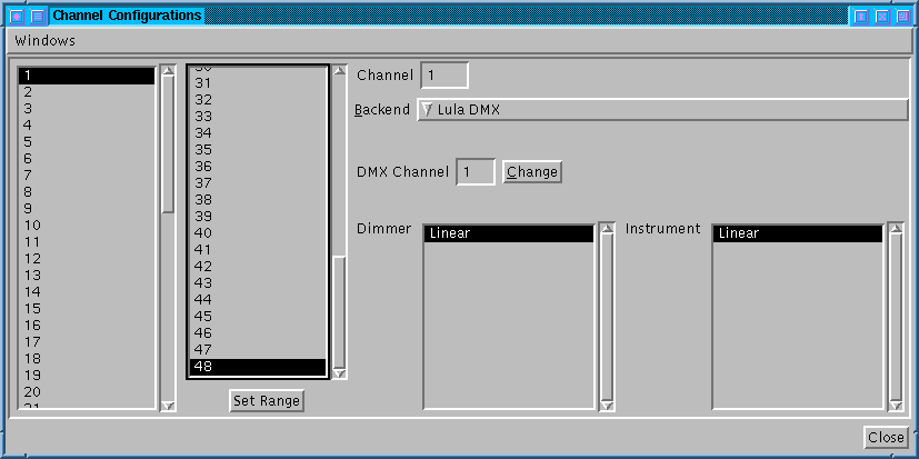 Es wäre mühsam, jeden Kanal einzeln konfigurieren zu wollen. Deshalb erlaubt Lula, gleich einen ganzen Bereich von Kanälen ,,auf einen Streich'' zuzuweisen. Um also die Kanäle 1-48 auf die DMX-Kanäle 1-48 zu legen, muß in der linken Liste die 1 und in der rechten die 48 selektiert sein, und rechts muß die Lula DMX angewählt sein.