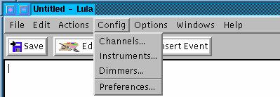 Mit dem Beleuchten kann es noch nicht sofort losgehen: Lula ist in der Lage, eine beliebige Anzahl von Dimmerkanälen mit verschiedenen Methoden anzusprechen. Um mit der Arbeit anzufangen, ist es nötig, Lula mitzuteilen, welche Dimmer wie angeschlossen sind. Diese Umstände müssen erst einmal konfiguriert werden. Am wichtigsten ist es, dem System mitzuteilen, über was für eine Schnittstelle die Dimmer angesteuert werden. Für diese sogenannte Konfiguration ist ein eigenes Menü zuständig -- das Config-Menü: