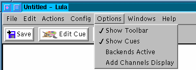 Damit ist die Konfiguration für die Zwecke des Tutorials abgeschlossen. Falls tatsächlich eine Lula DMX angeschlossen und eingeschaltet ist, läßt sie sich mit der Auswahl von Backends Active im Options-Menü aktivieren.